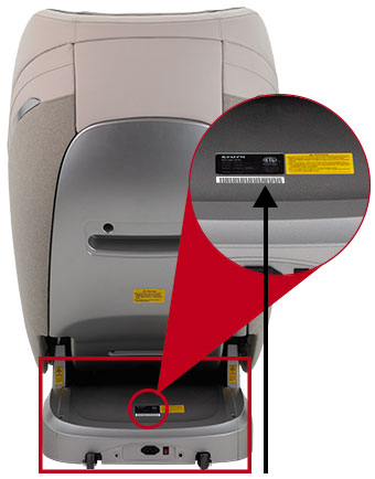 Serial Number (white barcode sticker) is found on the back, and bottom of the chair. Exact location varies by chair.